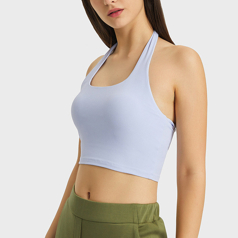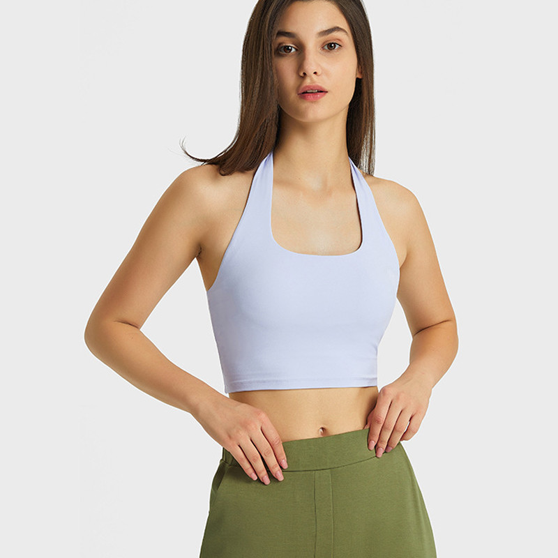 लगाम गर्दन महिला स्पोर्ट्स ब्रा हटाने योग्य पैड के साथ सेक्सी प्लेटेड बैक क्रॉप टॉप